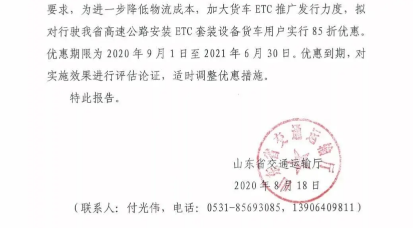 山東省表示:為進一步降低物流成本,加大貨車ETC推廣發行力度,擬對行駛在山東省高速安裝ETC套裝設備貨車用戶實行85折優惠,期限為2020年9月1日至2021年6月30日。