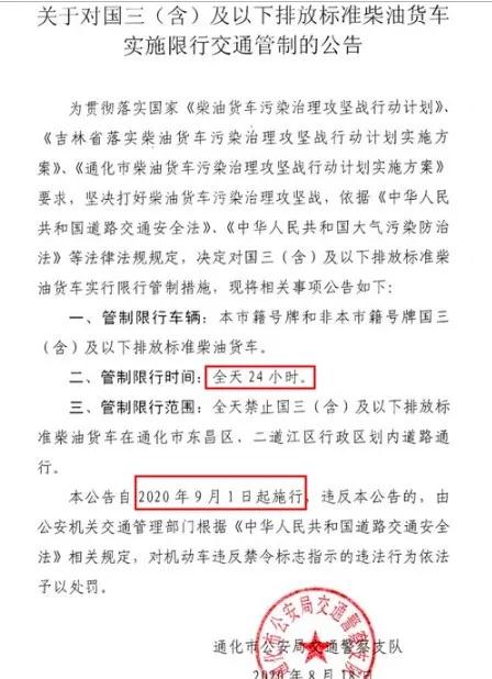 管制限行范圍:全天禁止國三(含)及以下排放標準柴油貨車在通化市東昌區、二道江區行政區劃內道路通行。